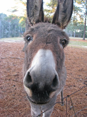 First off, I suppose I should explain... Our neighbors asked us to 'be-friend' their donkeys so maybe we could de-worm them... well we have been going over there quite a bit lately... anyway, we decided we would name them so we wouldn't always be calling them "The Male, Granny, Mother, and Baby", kinda boring, right?! So, we named them after some characters from the 'The Apple Dumpling Gang' movie: (The Male) - Donavan, (Granny) - Clarice, (Mama) - Magnolia, (Baby) - Apple Dumpling... and probably just call it 'Dumplin'! :-)